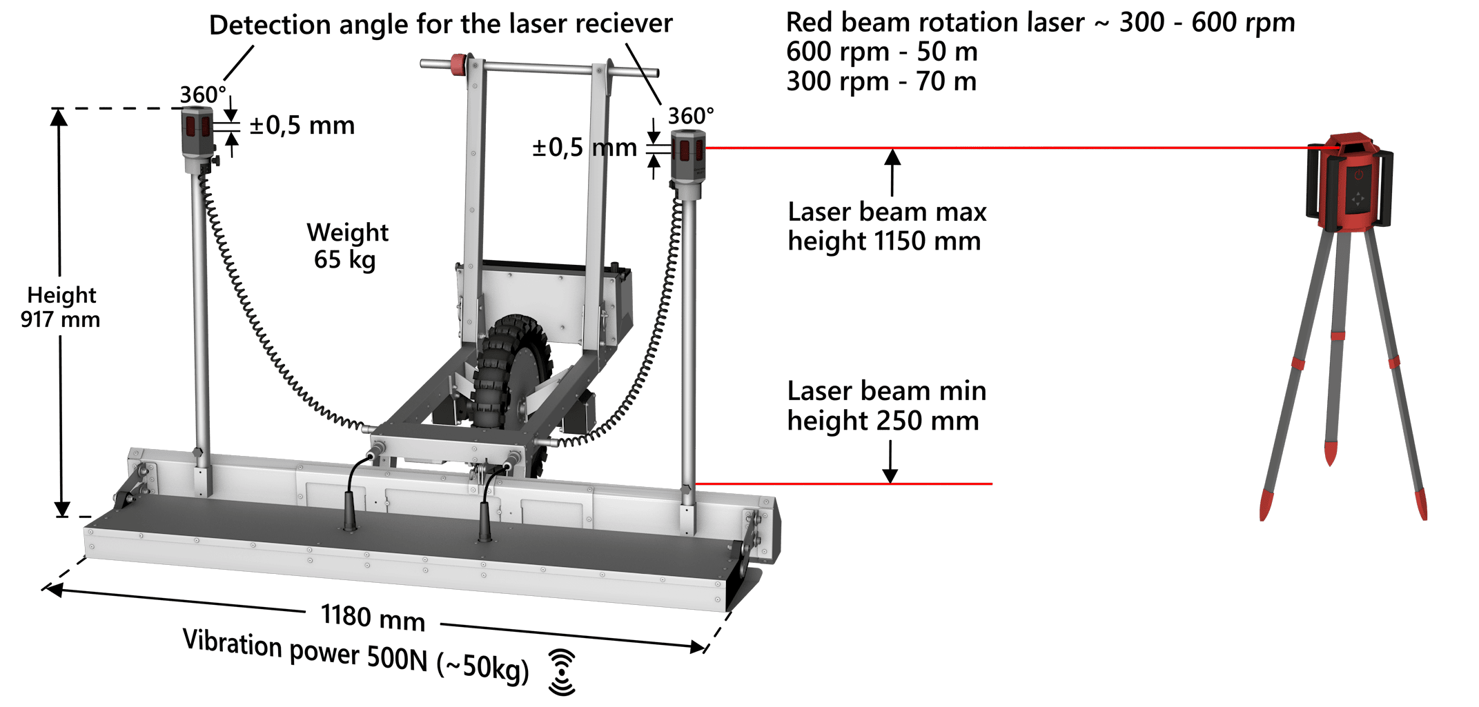 Die Maschine arbeitet mit einer Rotationslaserführung zusammen und liefert erstaunliche Ergebnisse mit einer Präzision von ± 1 mm.