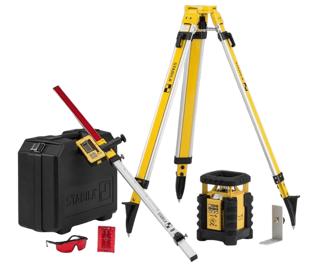 Alle unsere Nivelliergeräte sind mit jedem Rotlicht-Rotationslaser kompatibel. Wenn Sie dennoch einen Rotationslaser mit unserer Maschine kaufen möchten und der Meinung sind, dass Stabila LAR 160 ist das nicht ausreichend, dann können wir Ihnen den Stabila LAR 350 Rotationslaser anbieten –komplettes 9-teiliges SetLaser, Empfänger, Fernbedienung, Stativ, Nivellierlatte, 90°-Winkelschiene, Schutzbrille, Zielplatte und Tragetasche – für 1588 €Der LAR 350 ist ein robuster Rotationslaser, der für anspruchsvolle Bauaufgaben entwickelt wurde. Er unterstützt die horizontale und vertikale Ausrichtung sowie die manuelle Neigungsverstellung in zwei Achsen.